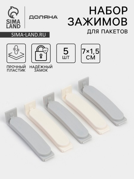 10747663 Зажимы для пакетов Доляна, пластик, 7×7.5×1.5 см, набор 5 шт., белые/серые