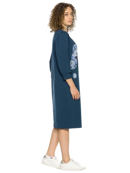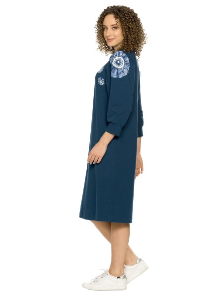 Платье из мягкого футера прямого свободного кроя. Рукав со сборкой по окату при небольшой длине плечевого шва не расширяет плечевой пояс. Горловина и манжеты из рибаны. Стойкий эластичный принт размещен ассиметрично. Текст glossy rabber. Перевод Женское сердце это глубокий океан секретов.