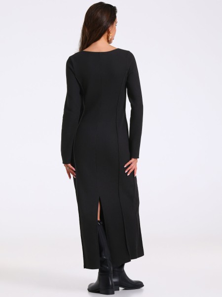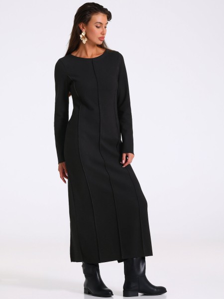 Женское платье выполнено из теплого вязаного полотна в рубчик. Изделие полуприлегающего силуэта с длинными рукавами, с необработанным низом изделия и рукавов. На полочке рельефы из проймы и отстрочка по центру, на спинке средний шов и рельефы из проймы. Уход: только бережная машинная стирка до 40C (руками не стирать), изделие вывернуть наизнанку, без предварительного замачивания. Барабанная сушка запрещена.