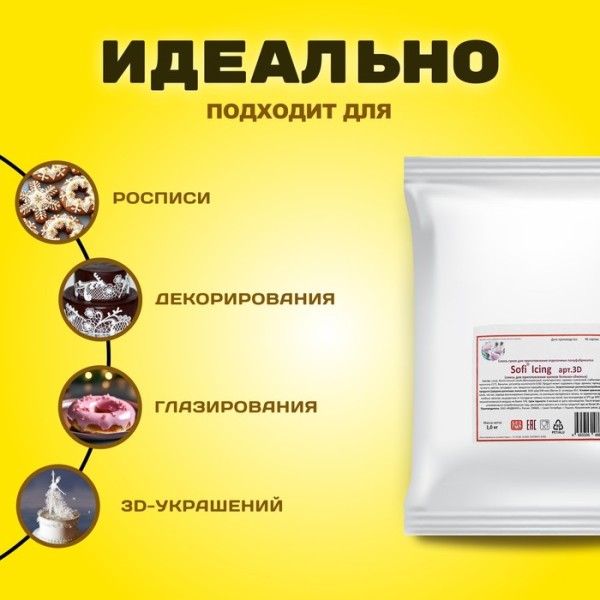 * Рецептура, которая подходит для «моделирования», создания объемных фигур: 1 кг смеси Sofi Icing арт. 3D, 0,140 кг воды (температура 35-400С) тщательно перемешать до однородной консистенции, и оставить на 20 минут, до полного растворения. Взбить на средних оборотах миксера, в течение 3 – 5 мин., пока масса не побелеет и не увеличится в объеме.