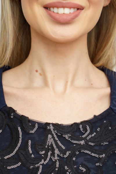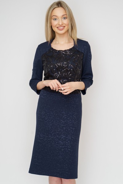 Женское платье полуприталенного силуэта. Лиф платья двухслойное - кружевное плотно с пайетками. Рукава 3/4.