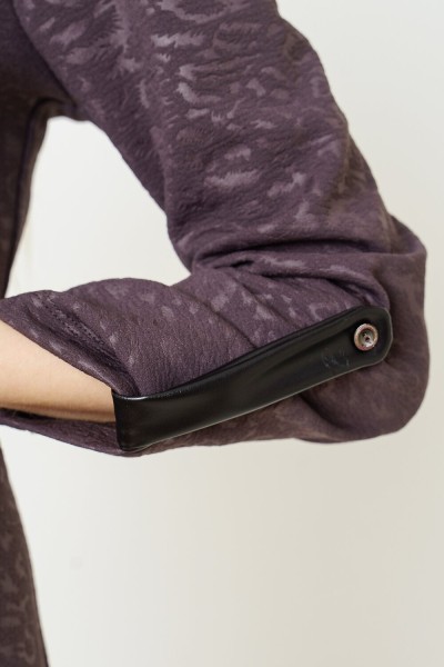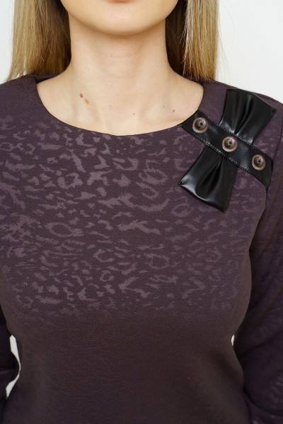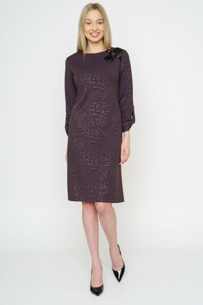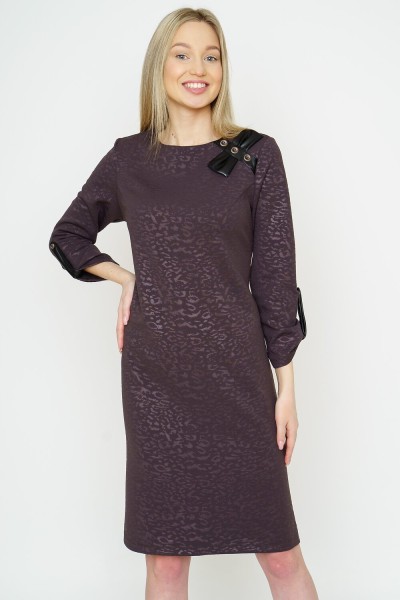 Женское платье полуприталенного силуэта. Сверху платья бант с пуговицами. На рукавах имеются паты.
