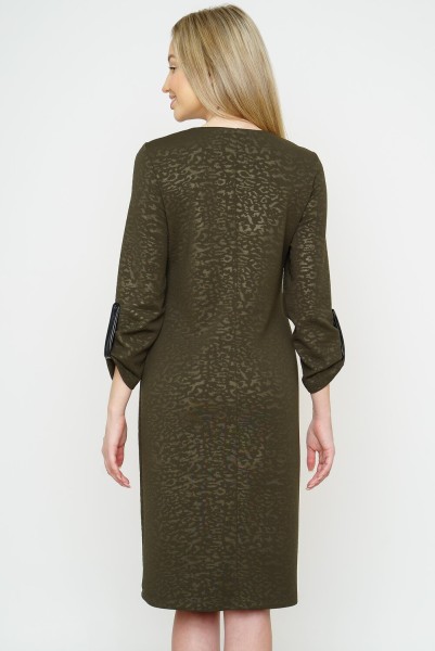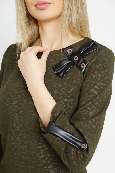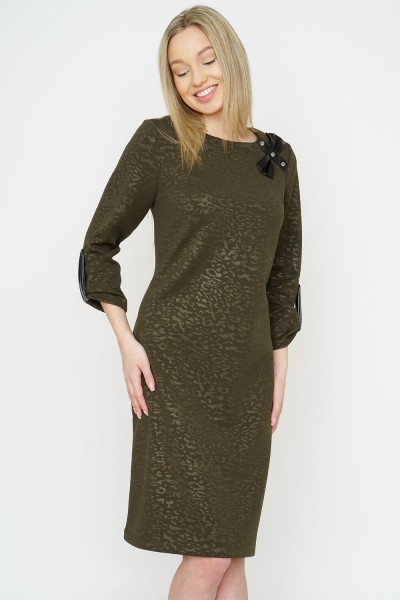 Женское платье полуприталенного силуэта. Сверху платья бант с пуговицами. На рукавах имеются паты.