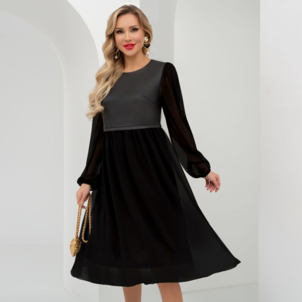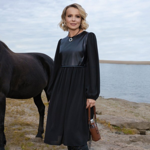 Новые формы трендов в 2022 от Charutti: платье со вставкой из эко-кожи станет хитом и в этом сезоне. Полупрозрачный шифон, силуэт Трапеция для безупречной посадки. Актуальная модель для обновленного гардероба!