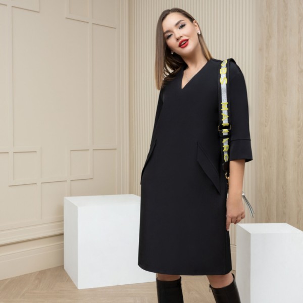 Платье чехол со свободной посадкой и острым вырезом. Провокация и свобода. Акцентные карманы и трендовая длина. Идеальный спутник по твоим делам. Рекомендуем сочетать с высокими сапогами и светлыми аксессуарами.