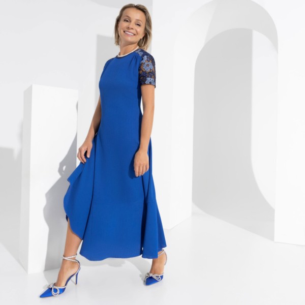 Это платье идеального кроя. Оно "вытягивает" фигуру, визуально делая вас выше и стройнее. В платье четко прослеживается тренд на длину макси. Вставка на юбке добавляет пикантный и модный акцент.