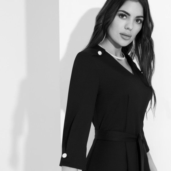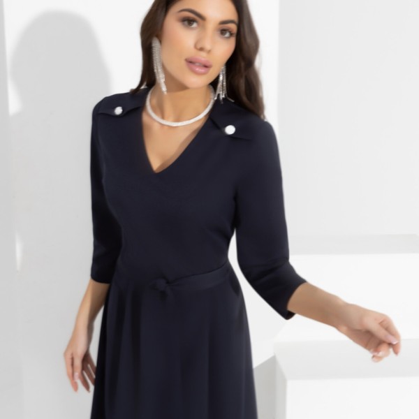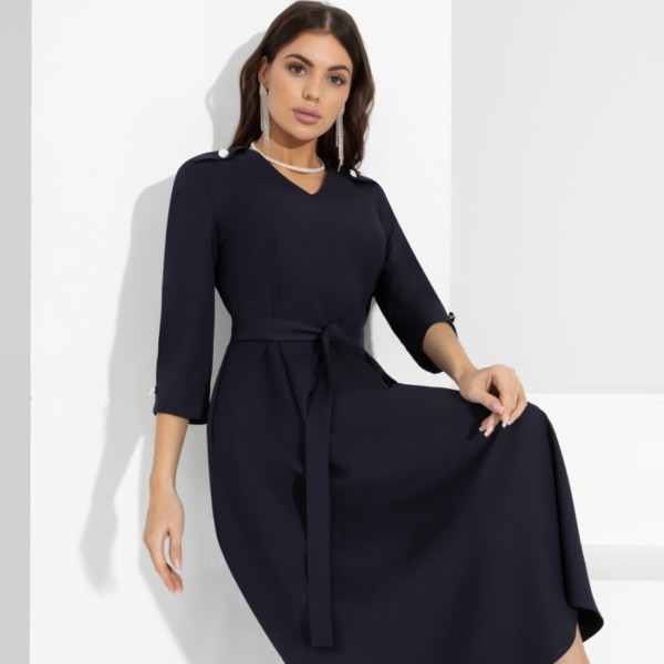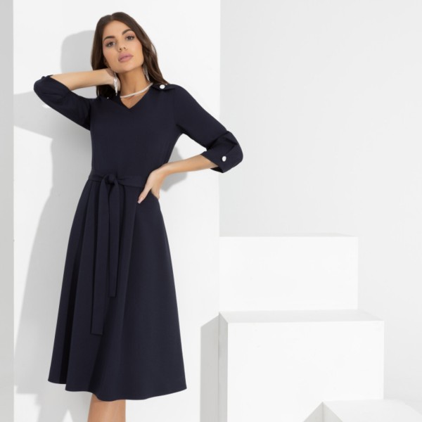Благородное платье глубокого синего оттенка с акцентным поясом. Силуэт и цвет работают над созданием дополнительного эффекта стройности. Платье выгодно оттеняет украшения и аксессуары. Ничего лишнего.