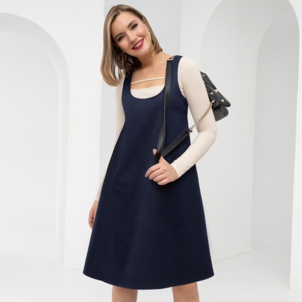 Идеальный силуэт, четкий крой и посадка. Классическая трапеция, заметные лямки, трендовая длина. Модель молодит фигуру и поднимает настроение. Подходит для офиса.
