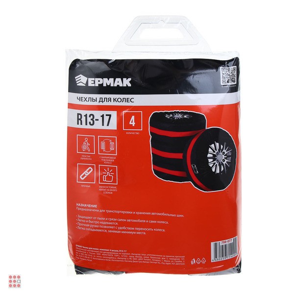 Чехлы для колес для колес радиусом R13-17 – это комплект из четырех чехлов, предназначенных для транспортировки и хранения автомобильных шин. Выполнены из прочного и износостойкого полиэстера, поэтому прослужат много сезонов. Имеют маркировку для каждого колеса, что значительно упростит монтаж сезонных шин. Эффективно предохраняют от пыли и грязи салон автомобиля и сами колеса. Легко и быстро надеваются, надежно фиксируя шины при помощи стяжек. Компактные в сложенном виде. Прочная ручка позволяет с удобством переносить колеса в случае необходимости.