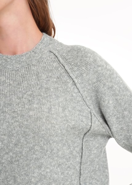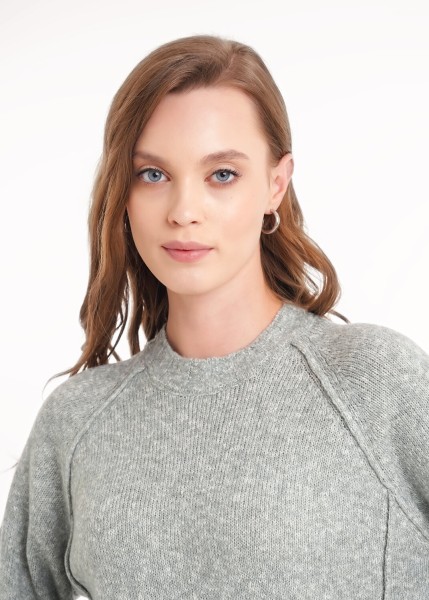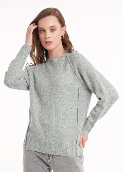 Вязаный джемпер прямого силуэта из акриловой пряжи с добавлением хлопка.Основное переплетение гладь. Длинный рукав реглан. Припуски наружу ,красивые сбавки по рукаву реглан. По низу рукава и изделия манжеты. Округлая горловина с бейкой.