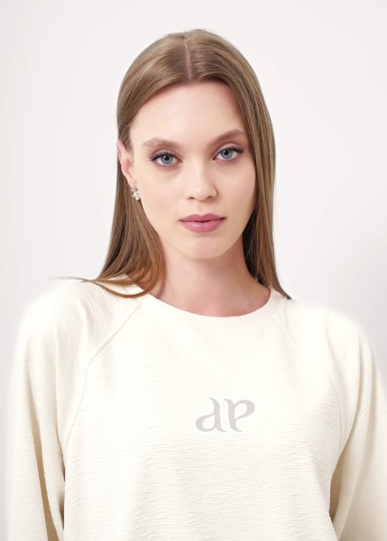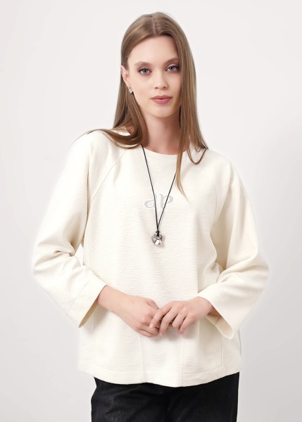 Джемпер прямого силуэта из трикотажного полотна джерси фактурное. Округлая горловина с обтачкой. Длинный рукав реглан,сверху по плечу вытачка. Спереди вертикальные резы с карманами в шве и закреплением мешковины. Боковые разрезы.Спереди вышивка.