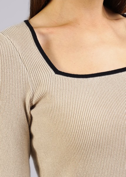 Вязаный джемпер из эластичной пряжи с вискозой в составе. Длинный втачной рукав. Квадратная форма горловины по краю декорирована контрастной черной отделкой.
