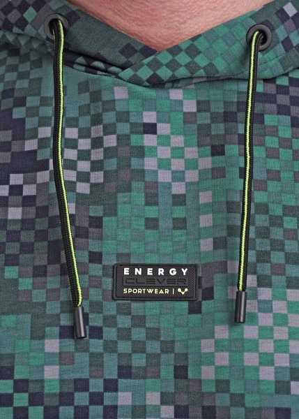 Молодежная толстовка с капюшоном из яркой дизайнерской набивки. Удобные спущенные рукава. В модели манжеты по рукавам и низу изделия. Хорошо сочетается с джинсами и спортивными брюками.