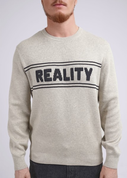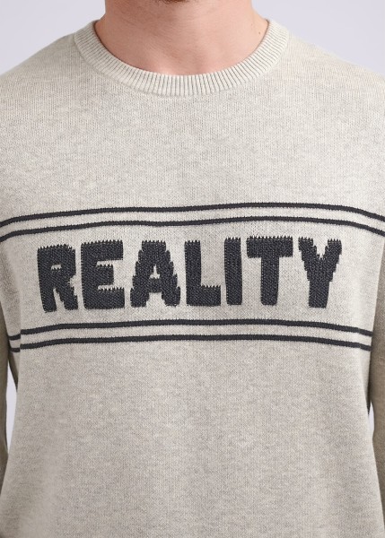 Мужской вязаный джемпер с круглым вырезом горловины и длинным рукавом. Джемпер из смесовой пряжи с хлопком, модель дополнена вывязанным текстовым рисунком. Изделие подойдет к любому низу.