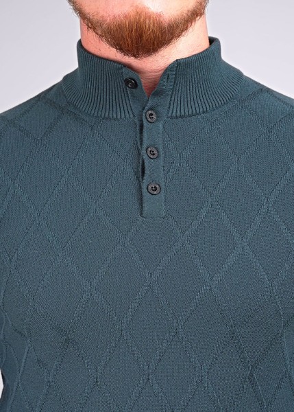Мужской джемпер с воротником стойка на пуговицах, с длинным рукавом. Модель связана из приятной хлопковой пряжи с добавлением акрила с вывязанным геометрическим рисунком по полочке. Изделие можно сочетать как в классическом стиле, так и в повседневном.