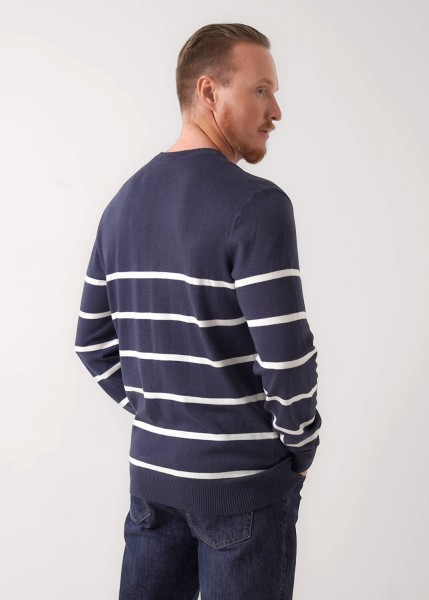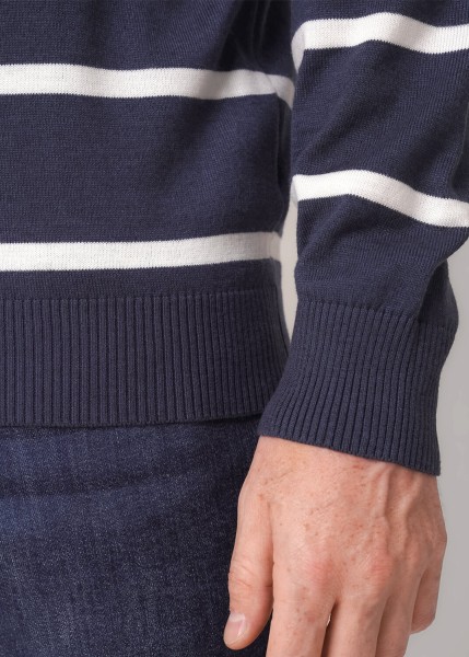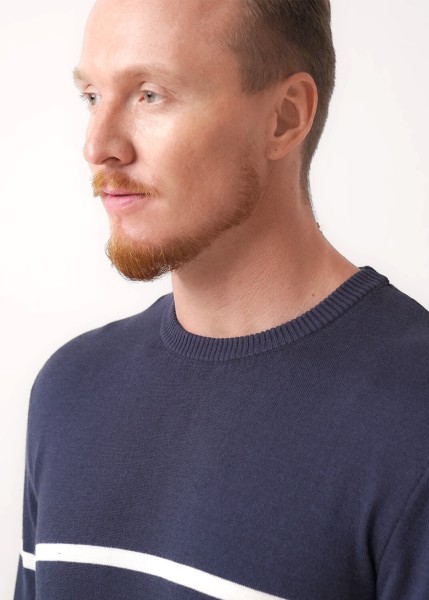 Джемпер мужской в полоску из смесовой хлопковой пряжи с длинным рукавом и круглой горловиной. Прекрасно сохраняет тепло, комфортный в носке, отличное решение на холодное время года. Комбинируется с джинсами или брюками.