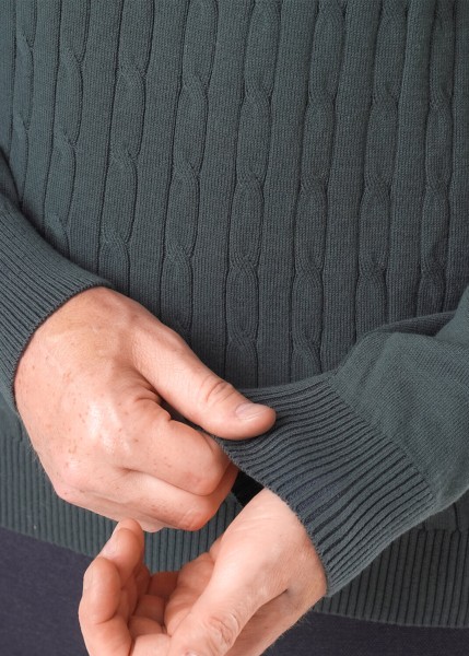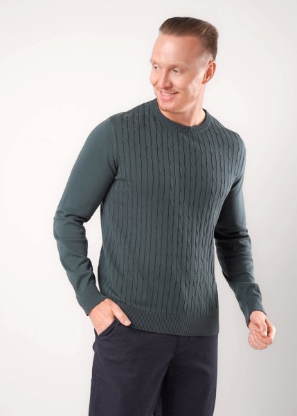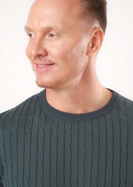 Джемпер мужской из смесовой хлопковой пряжи с длинным рукавом и груглой горловиной. Изделие дополнено вязкой с классическим узором "косы". Прекрасно сохраняет тепло, отличное решение на холодное время года. Комбинируется с джинсами или брюками.
