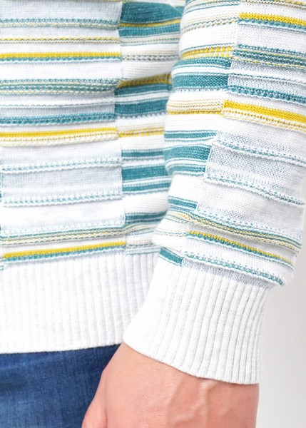 Мужской джемпер из смесовой пряжи с круглым вырезом горловины и длинным рукавом. По низу рукава и изделия комфортная эластичная резинка. Модель интересна за счет кокетки и комбинации плашечной цветной вязки, а так же дополнена металлофурнитурой.