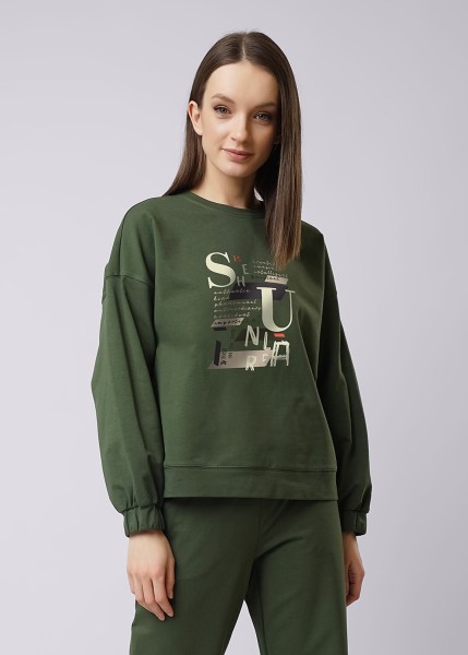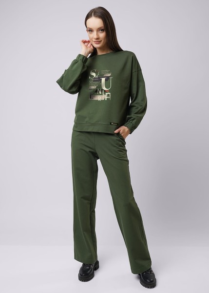 Толстовка укороченная из футера 2-х нитки. Окурглая горловина. Спущенная линия плеча. Рукав обработан манжетом на резинке с напуском . Притачной пояс. Завершает дизайн нашивка и принт.