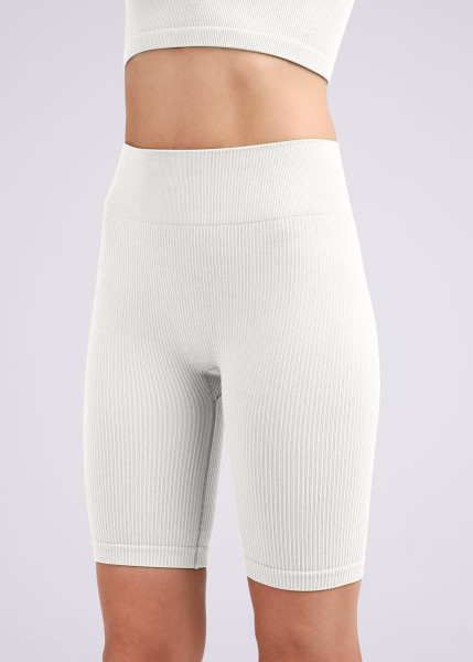 Женские шорты в рубчик с высокой посадкой. По талии широкая резинка, обеспечивающая комфортную посадку.