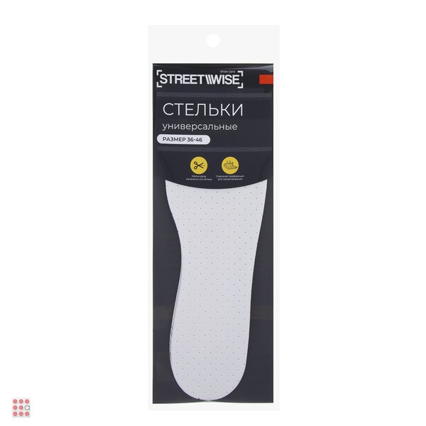 Универсальные стельки StreetWise изготовлены из высококачественных материалов: латекса и полиэтилена. Они подходят для обуви размеров от 36 до 46 и имеют толщину 2,5 мм. Сквозная перфорация обеспечивает хорошую вентиляцию, что делает их идеальным выбором для активного образа жизни. Белый цвет стелек придаёт им стильный и современный вид.