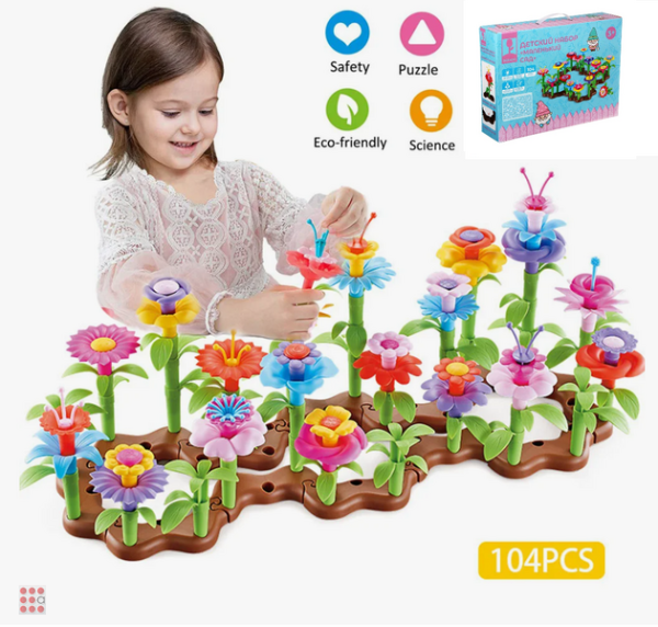 Детский набор строительных блоков "Маленький сад" - настоящая цветущая лужайка у вас дома. Ребенок может создать невероятный сад с цветами. Игра развивает воображение, мелкую моторику. Включает 104 детали.