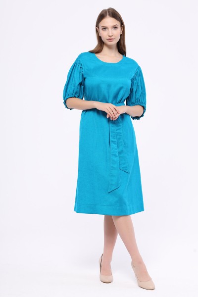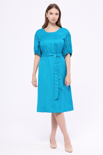 Полуприлегающее платье с круглым вырезом из нтуральной смесовой ткани с рельефами по груди, карманами в боковых швах и дизайнерскими романтичными рукавами. Пояс в комплекте.
