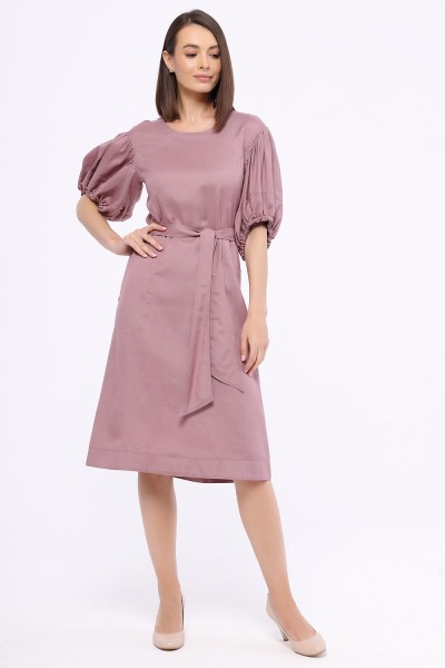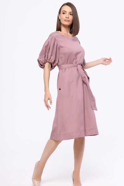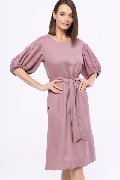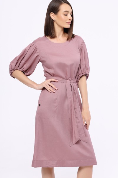 Полуприлегающее платье с круглым вырезом из нтуральной смесовой ткани с рельефами по груди, карманами в боковых швах и дизайнерскими романтичными рукавами. Пояс в комплекте.