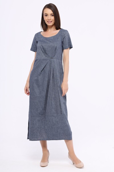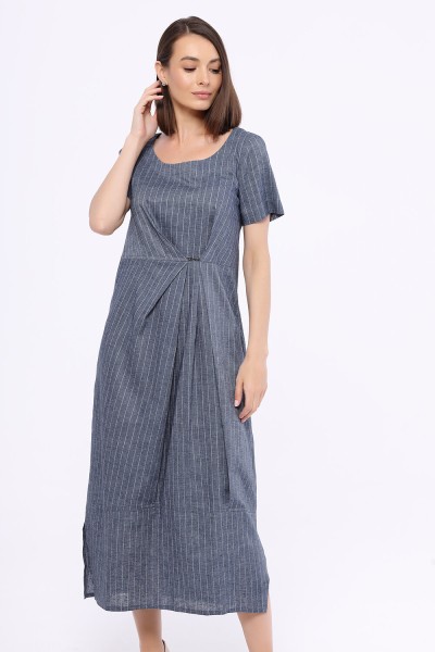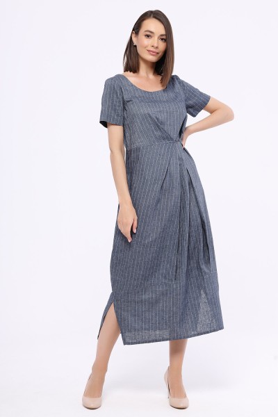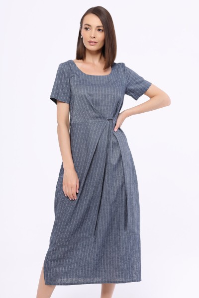 Романтичное летнее платье полуприлегающего силуэта с коротким рукавом и декоративной ассиметричной драпировкой по линии талии из смесовой ткани - лён с полиэстером, российского производства бренда D'imma. Лен в сочетании с полиэстером держит форму, гигроскопичен, менее сминаем. Широкий размерный ряд, в том числе большие размеры.