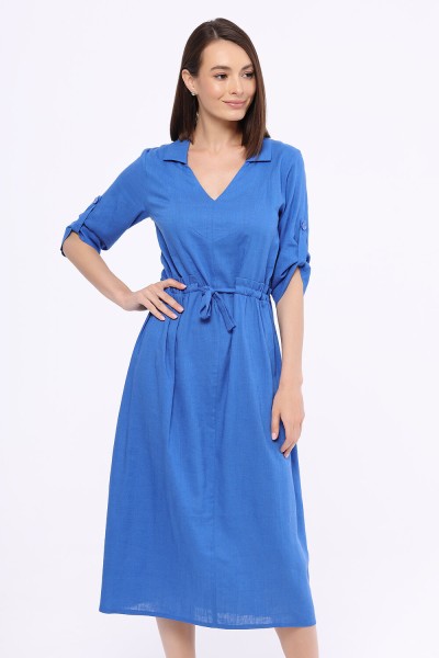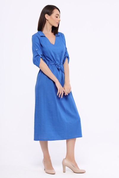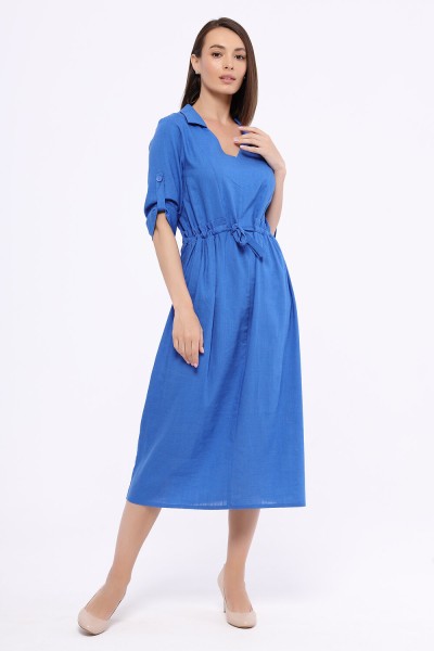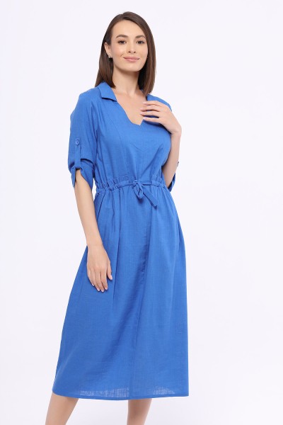 Полуприлегающее платье с круглым вырезом из нтуральной смесовой ткани с рельефами по груди, карманами в боковых швах и дизайнерскими романтичными рукавами. Пояс в комплекте.