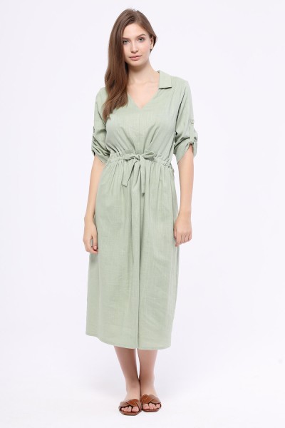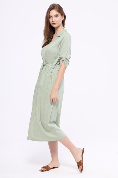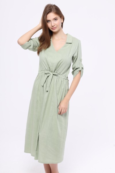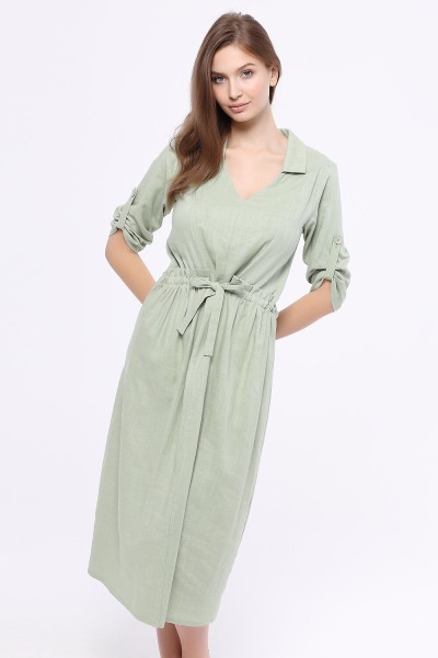 Оригинальное длинное платье из смесовой натуральной ткани с V - образным вырезом и воротником. Рукав 3/4, регулироуемый патой на пуговице. На линии талии по бокам пришиты кулиски, с помощью которых можно менять силуэт изделия.