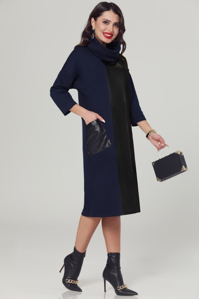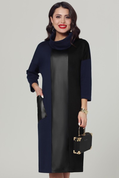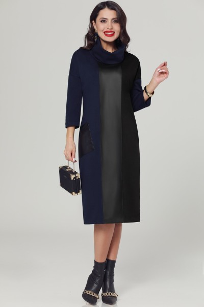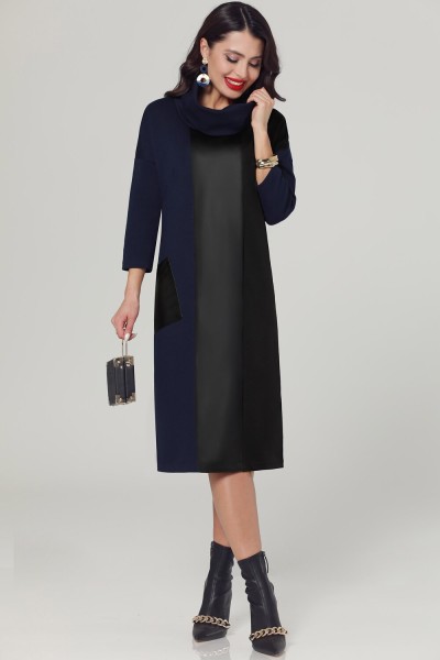 Интересное комбинированное платье прямого свободного силуэта. Объемный воротник-хомут красиво оформляет вырез горловины. Центральная часть переда выполнена из эко-кожи. Асимметричное сочетание двух цветов ткани с акцентом на одном кармане придает образу интеллектуальную нотку. Вещь самодостаточная и не требующая дополнительных аксессуаров.
