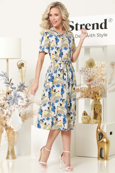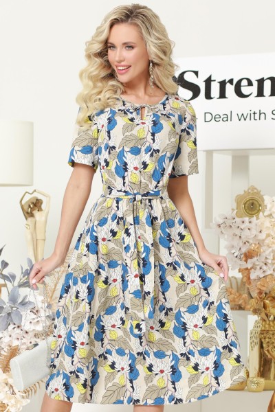 Легкое летнее платье с расклешенной юбкой и коротким рукавом. Горловина оформлена тонким кантом, переходящим в завязку-шнурок над вырезом-капелькой. Талия отрезная на резинке, но для удобства и красоты к платью прилагается пояс из той же ткани.