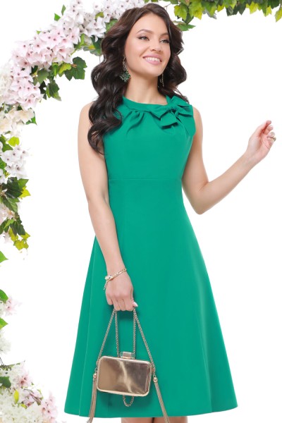 Платье полуприлегающего силуэта с завышенной отрезной талией выглядит всегда женственно и элегантно. Оригинально оформлена горловина модели, являясь ее главным украшением: аккуратные складки, подвернутая обтачка и очаровательный бант на плече превращают платье в абсолютно самостоятельную вещь, которой не нужны украшения. Подойдет и в пир, и в мир.