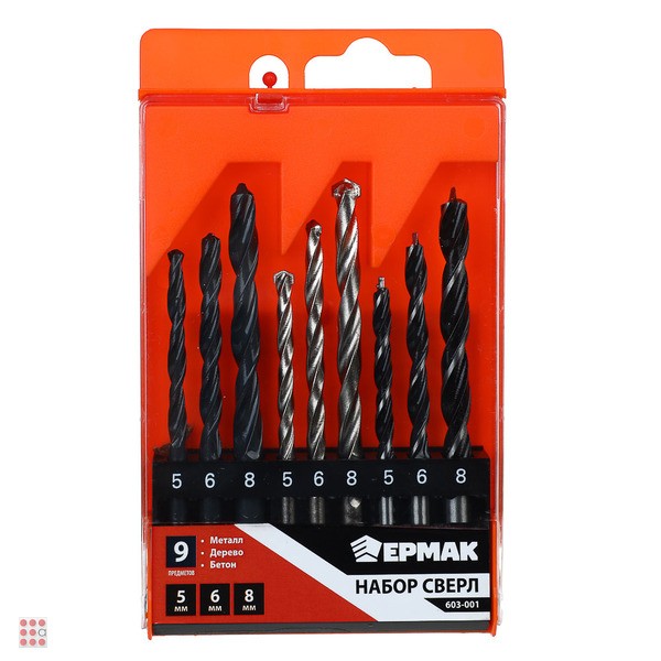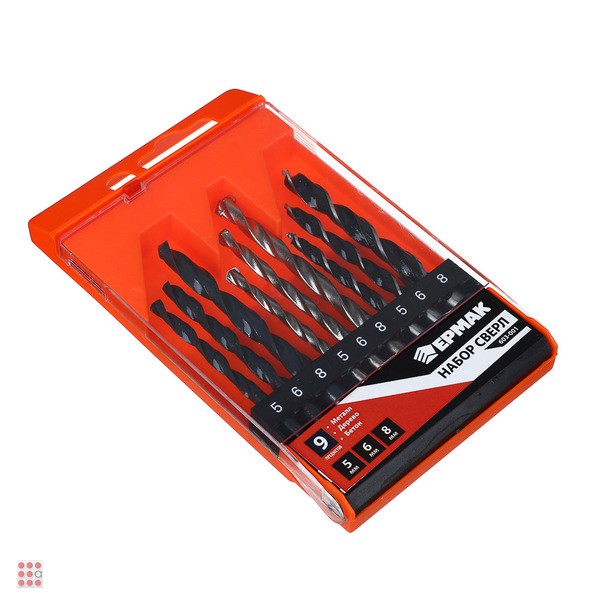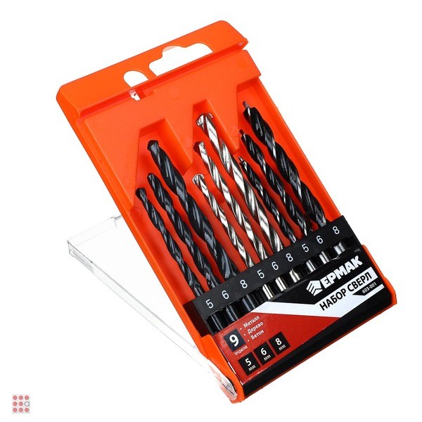 ЕРМАК Набор 9 пр: сверла по дереву (5-6-8 мм), по металлу (5-6-8 мм), по бетону (5-6-8 мм)
