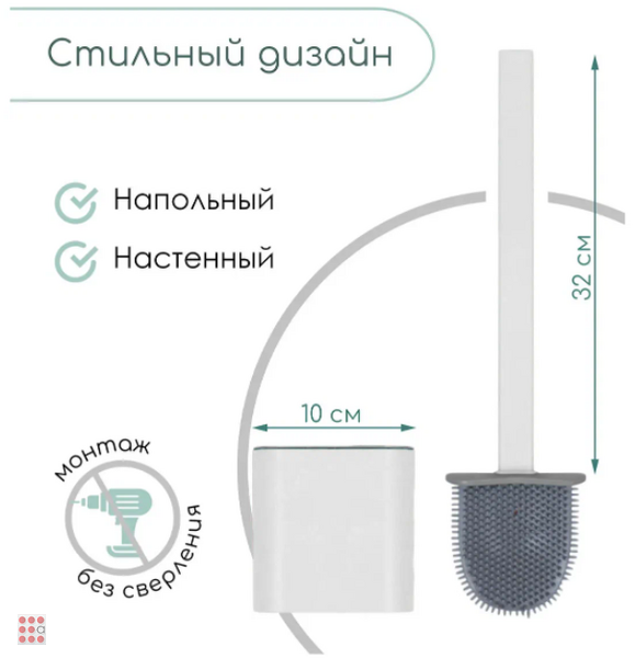 Также, специальное крепление для силиконового ершика в комплекте позволяет установить его по вашему желанию на стене без какого-либо сверления. Узкая компактная подставка займет немного места в Вашей ванной комнате.