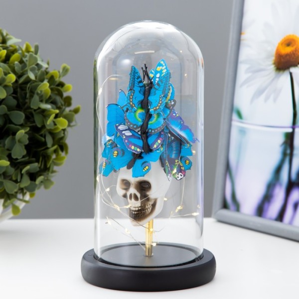 Фигурка светящаяся колба RISALUX «Бабочки и череп», LED-ночник, от батареек 3×ААА, 11×11×22.5 см