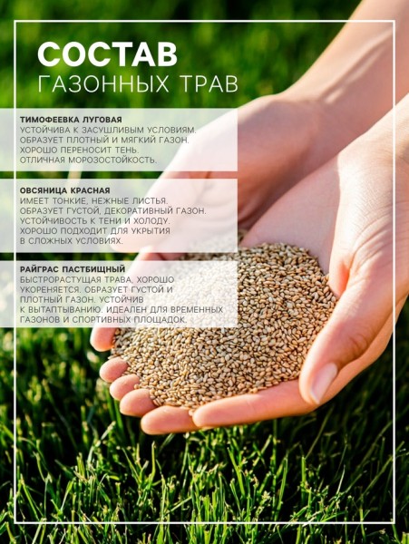 Состав: овсяница красная – 30%, райграс пастбищный – 30%, райграс – 20%, тимофеевка луговая – 20%