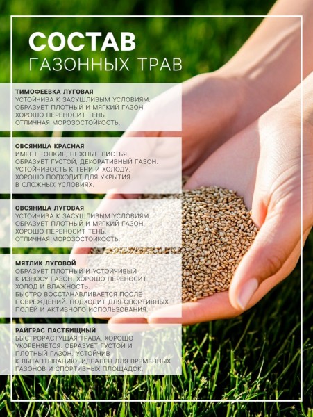 * Для нормального роста, укоренения и цветонасыщенности травы используйте специальные удобрения для газонов и цветников.
