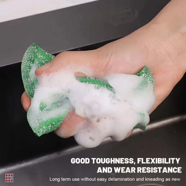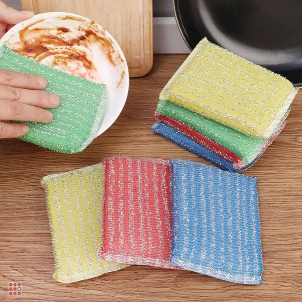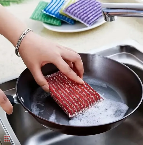 Губки предназначены для мытья посуды, столовых приборов, кухонной утвари, а также подходят для чистки поверхности плит, раковин, ванн и кафеля. Благодаря металлизированным нитям изделие справляется с трудными пятнами. Хорошо впитывает воду и экономит моющее средство.