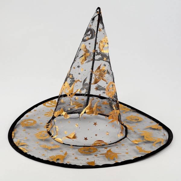 * Шляпа с прозрачной тульей и широкими полями украшена золотым принтом. Такой головной убор станет изюминкой костюма.