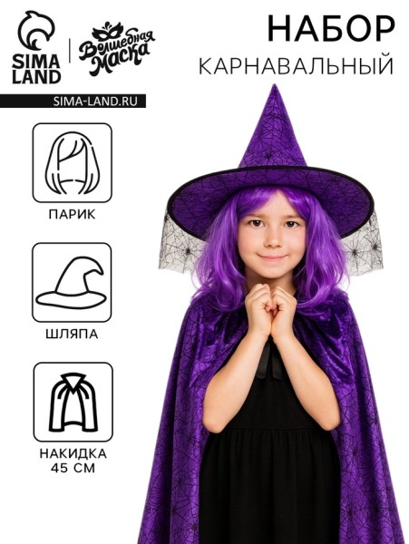 Карнавальный набор в фиолетовых тонах станет отличным дополнением для создания яркого и запоминающегося образа. В комплект входят шляпа, накидка и парик, которые помогут создать образ в тематике волшебства и магии.