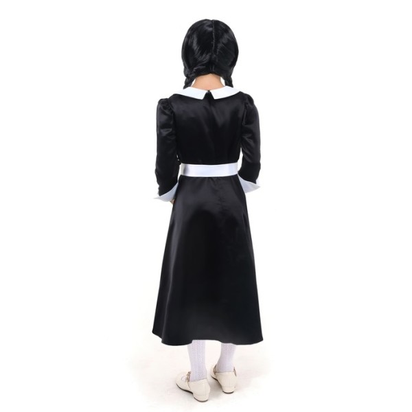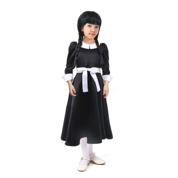 * Платье: — элегантное чёрное платье из атласа и полиэстера с белым воротником, который придаёт образу нотку строгости и изысканности. Талию подчёркивает стильный белый бант.