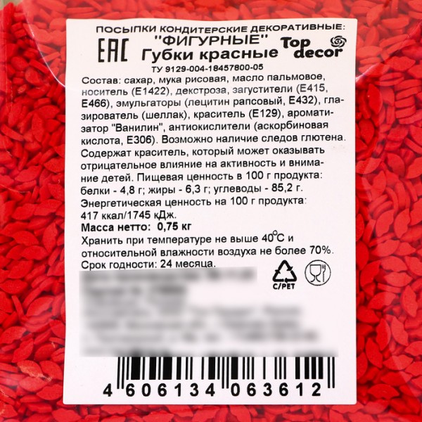 Упаковка в 750 г позволит вам с легкостью украсить множество сладостей и делиться ими с близкими. Посыпка «Губки» не только красиво выглядит, но и добавляет приятный хруст, что делает её идеальным дополнением к десертам. Превратите каждое ваше угощение в настоящий шедевр с помощью этой яркой и оригинальной красной посыпки и наслаждайтесь радостью творчества на кухне!