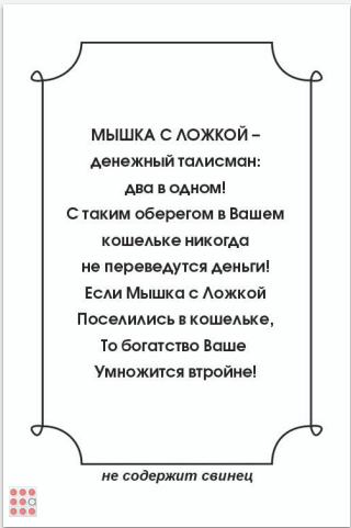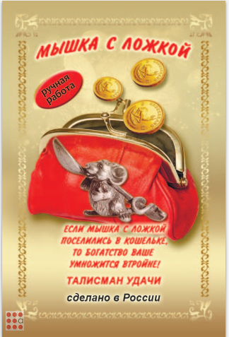 Существует поверье, что поселившись в портмоне, такая мышка начинает охранять и приумножать благосостояние своего гостеприимного хозяина. Нужно только не забыть произнести сакраментальную фразу «Мышка поселись, денежка водись». Размеры этого талисмана оптимальны для отделений кошелька, в которых обычно размещают банковские карточки или купюры. Ее присутствие практически не ощущается, разве что вдруг обнаружится существенное прибытие денег. Денежная мышь с ложкой загребушкой для кошелька – отличный подарок для тех, кому желают процветания и успеха. Она упакована в изящный пакетик, благодаря чему привлекательность сувенира существенно возрастает.