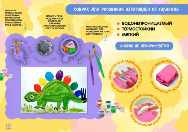 Универсальный силиконовый коврик подойдет для рисования, лепки и других видов творчества, является отличной защитой стола от загрязнений, а необычный дизайн и яркая раскраска помогут развить воображение и творческие способности ребенка. Коврик предназначен для работы с художественными красками - акварелью, гуашью и пастелью, также подойдет для работ с клеем, эпоксидной смолой, пластилином, соленым тестом, глиной и другими материалами для творчества. Размер изделия оптимален для бумаги формата А4. Детский настольный коврик не деформируется под воздействием влаги, не впитывает запахи и не скользит по столу, даже под наклоном. Благодаря эластичности, коврик компактно складывается и помещается в папку для рисования, труда и технологий, что делает его отличной заменой доски для творчества. Удобно брать с собой в школу и детский сад. Материал покрытия – 100% гибкий высококачественный силикон. Резиновая накладка на стол оснащена: ячейками для кисточек и фломастеров, отделением для канцелярских принадлежностей, подставкой под стаканчик для мытья кистей, подставкой для горизонтального хранения кисточек и фломастеров, бортиком по периметру, который не дает стекать краске на стол. Размеры в разложенном виде: длина – 415 мм, ширина – 370 мм, высота – 30 мм. Продукция SILIHOME произведена в России, поставка осуществляется от производителя.