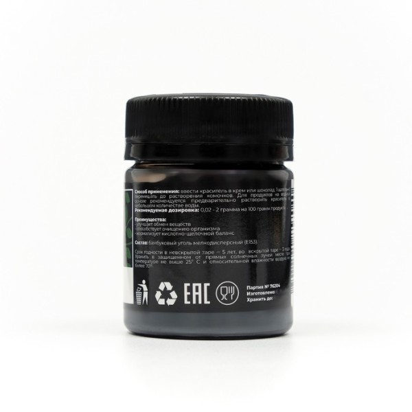 Натуральный пищевой краситель "Бамбуковый уголь" от компании ART COLOR окрашивает продукты в глубокий черный цвет. Натуральный состав полезен для здоровья, не имеет вкуса и запаха, не влияет на консистенцию блюд, содержит полезные минералы и микроэлементы. С натуральным пищевым красителем можно приготовить самые смелые и дерзкие блюда. Черный краситель пользуется популярностью не только в ресторанах, но и в домашних условиях у кулинарных мастериц. Пудра бамбукового угля содержит калий, кальций, железо, натрий и обладает широким спектром полезных свойств, снижает уровень холестерина, нормализует артериальное давление, действует как адсорбент и выводит из организма вредные токсины, успокаивает нервную систему.
