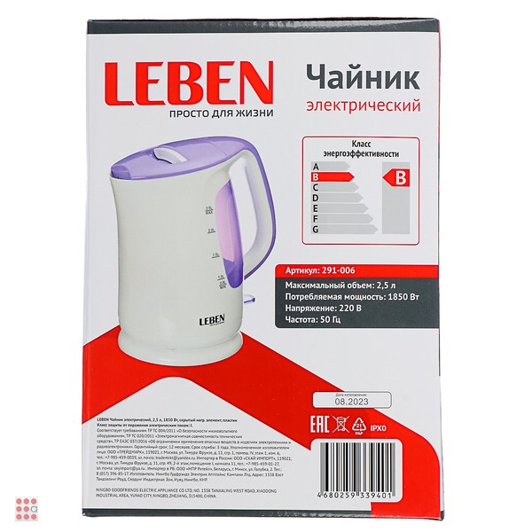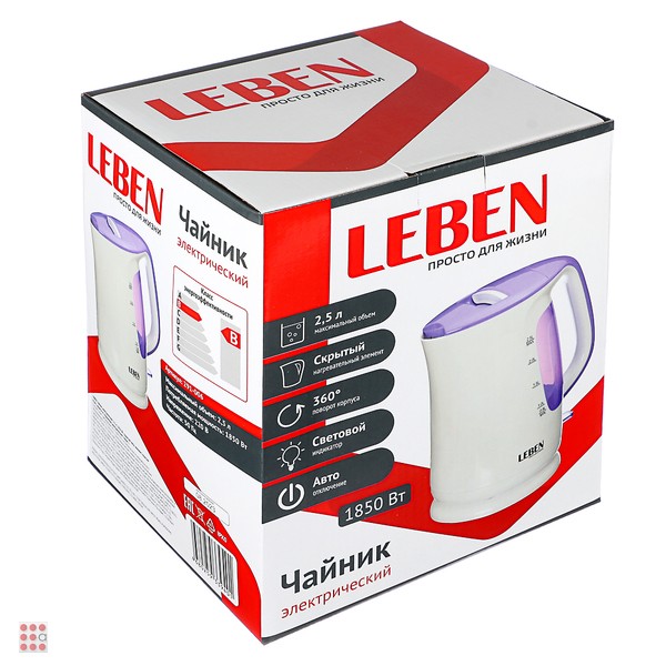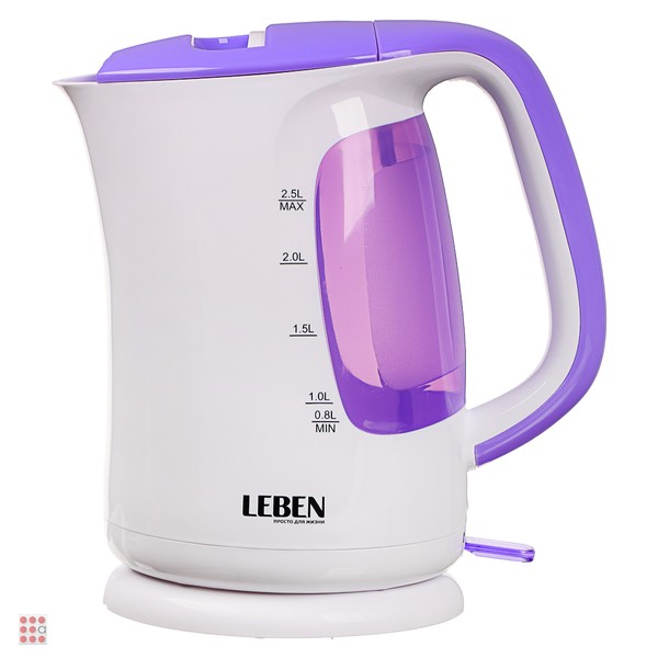 LEBEN Чайник электрический 2,5л, 1850Вт, скрытый нагр.элемент, пластик