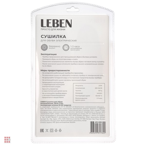 LEBEN Сушилка для обуви металлическая, 220В, 12Вт, температура нагрева 65-80 градусов