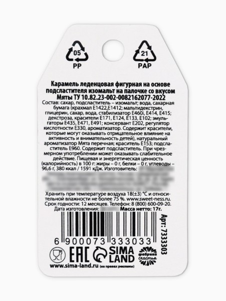 Состав: сахар, вода, патока, изомальт, сахарная бумага, ароматизатор (мята), пищевой краситель.